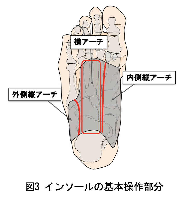 インソールで最も重要な操作部位は、「内側縦アーチ」「外側縦アーチ」「横アーチ」の3つです(図3)。