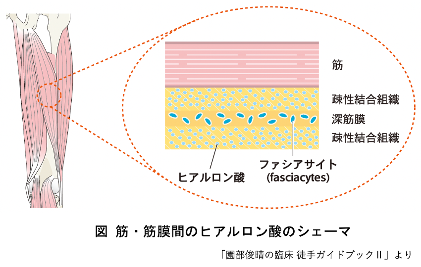 ヒアルロン酸は、筋膜と筋肉の間や筋膜の内部に存在し、組織間の滑走性を促すための潤滑剤のような働きをしています。
