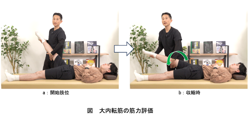 大内転筋の筋力を評価する場合、股関節伸展・内転方向に抵抗運動を行わせ評価します(図● )。