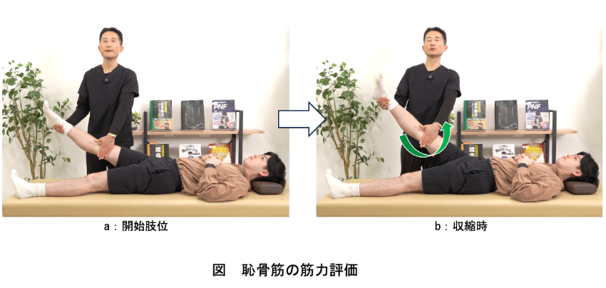 恥骨筋の筋力を評価する場合、股関節屈曲・内転・内旋方向に抵抗運動を行わせ評価します(図● )。この際、恥骨筋は屈曲要素も強いため、60度以上屈曲方向に内転させることが大切です。
